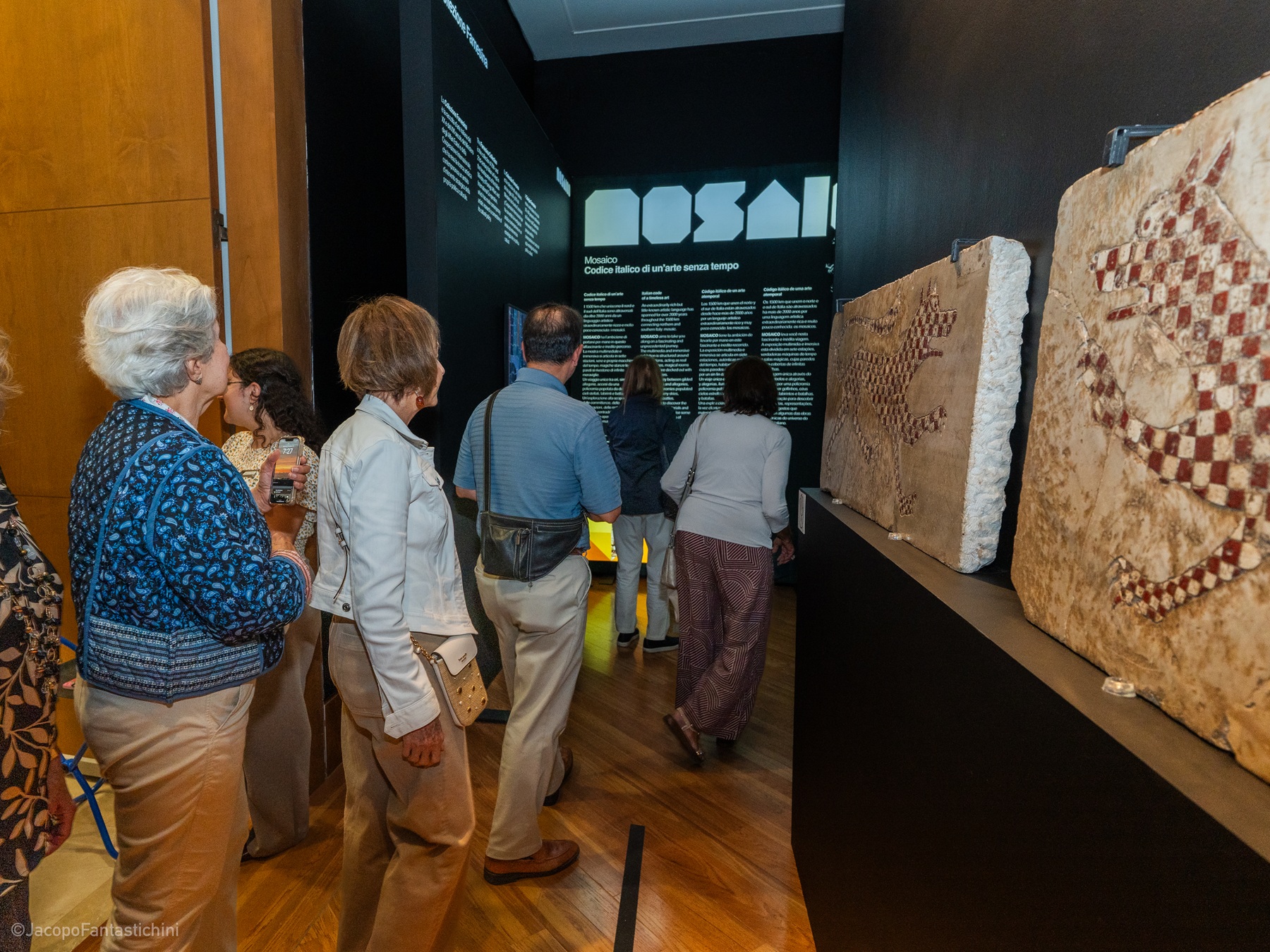 The Miami stage distinguishes itself with remarkable features. For the first time, the display is enriched by the presence of original artifacts generously loaned by the Regional Directorate of National Museums of Lazio: a pair of mosaics portraying a dog from the Abbey of Montecassino, and a floor panel originating from one of Emperor Caligula’s celebrated ships, preserved at the Museum of Roman Ships in Nemi.