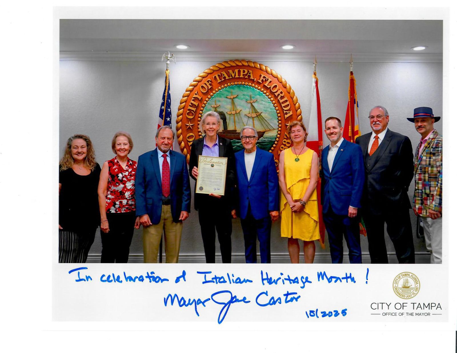 Città di Tampa – La Sindaca Jane Castor ha proclamato ufficialmente ottobre come Italian American Heritage Month a Tampa — un importante riconoscimento per la vivace comunità italiana locale, alla quale va la nostra più sincera gratitudine.